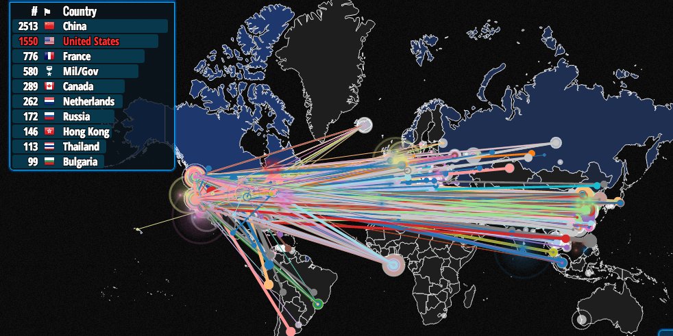 Az alábbi ábrán az látható, hogy egy adott pillanatban a különböző államok irányába hány betörési kísérlet történik. Az ilyen betörési kísérleteket jellemzően a fent említett ú.n. zombihálózatok követik el. Erről bővebben az alábbi linket olvashat: https://kiberhaboru.hu/